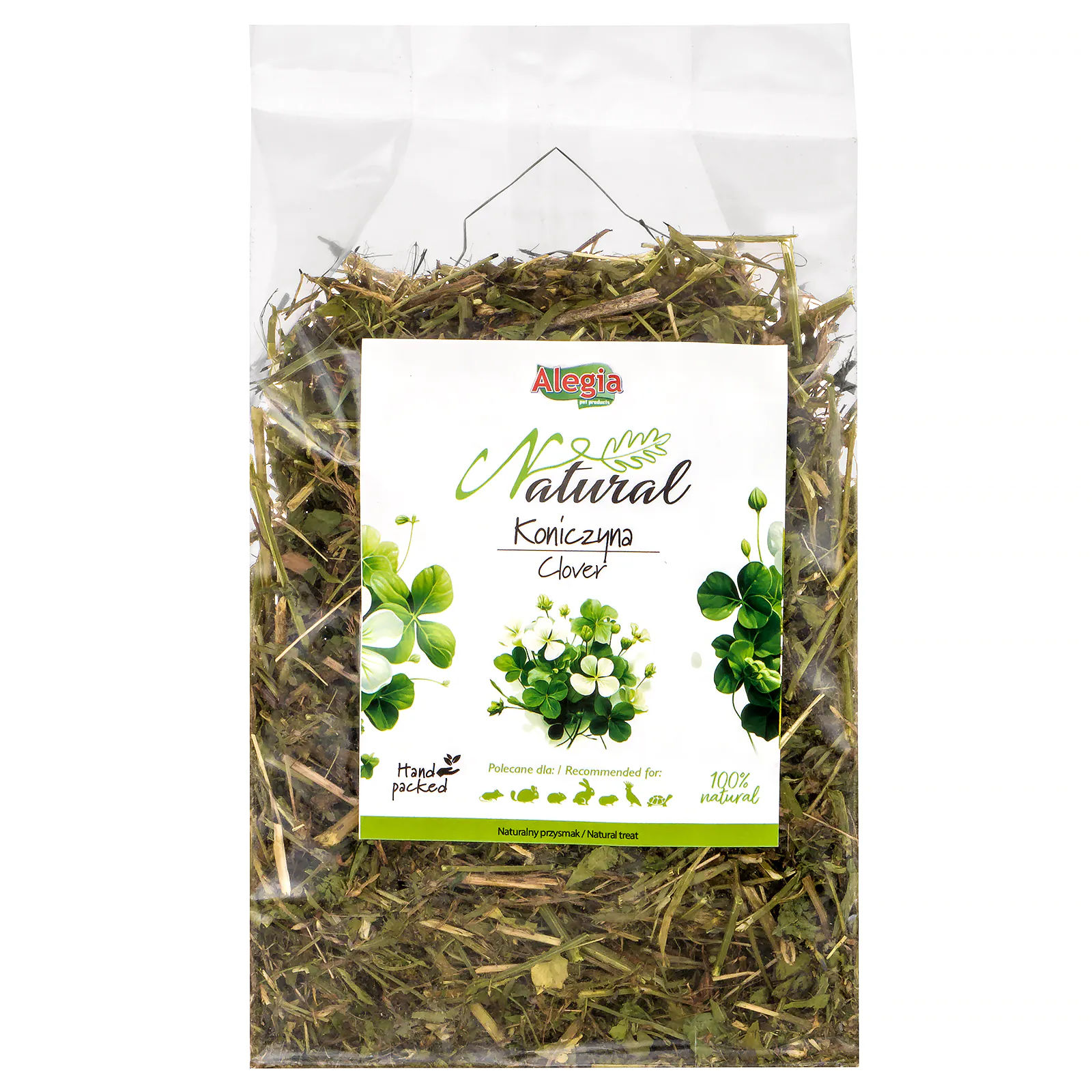 Koniczyna suszona Alegia to naturalny, ręcznie pakowany przysmak dla królików i gryzoni, bogaty w witaminę C i minerały, wspierający odporność, trawienie oraz zdrowie przewodu pokarmowego.