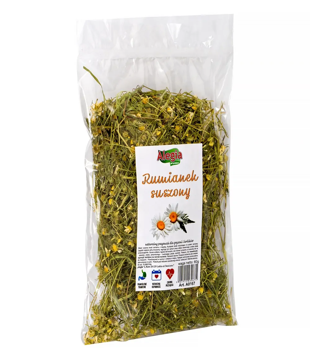 Rumianek 40g Alegia to idealny naturalny przysmak dla gryzoni i królików, może również służyć jako dodatek do ściółki.