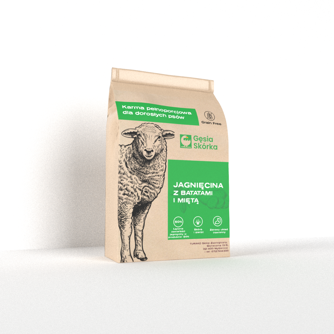 GĘSIA SKÓRKA GF 50 Jagnięcina z miętą - najwyższej jakości, bezzbożowa, pełnoporcjowa sucha karma dla dorosłych psów.
