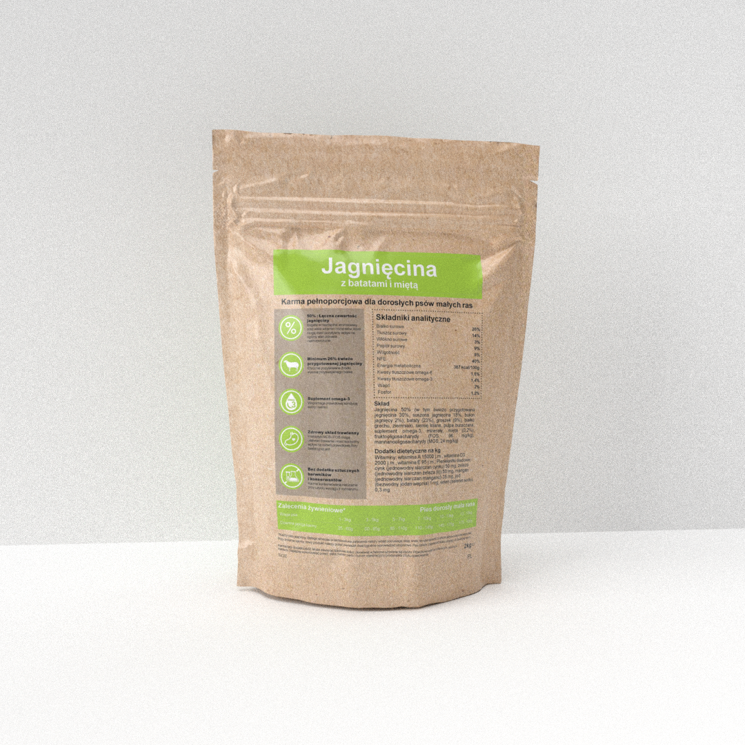 Jagnięcina 50% (w tym świeżo przygotowana jagnięcina 30%, suszona jagnięcina 18%, bulion jagnięcy 2%), bataty (23%), groszek (9%), ziemniaki, białko grochu, siemię lniane, pulpa buraczana, suplement omega-3, minerały, mięta (0,2%), fruktooligosacharydy (FOS, 96 mg/kg), mannanooligosacharydy (MOS, 24 mg/kg)