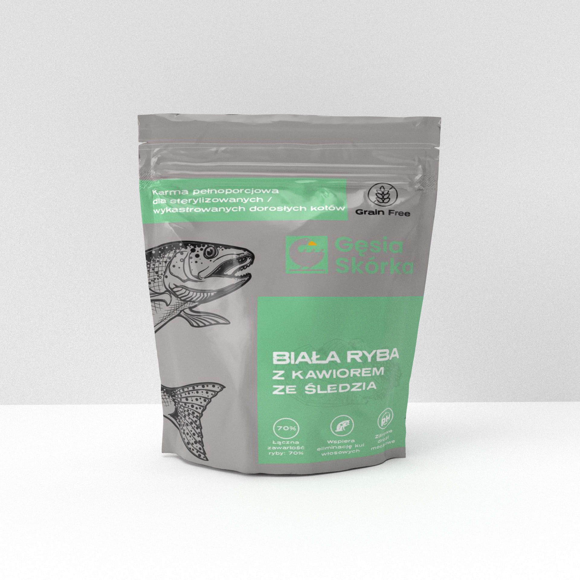 Gęsia Skórka — karma bezzbożowa dla sterylizowanego kota — biała ryba z kawiorem ze śledzia