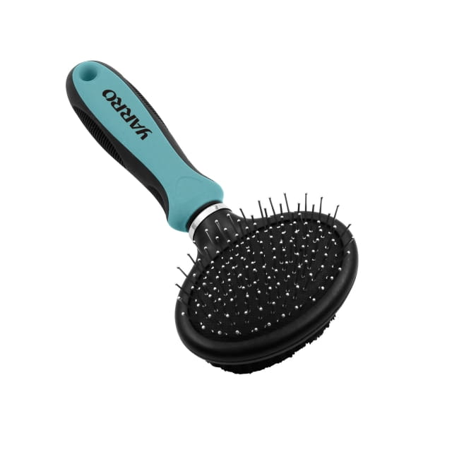 Szczotka do pielęgnacji sierści dla psów wszystkich ras, łącząca stalowe szpilki w elastycznym tworzywie oraz miękkie włosie. Delikatnie rozczesuje podszerstek i splątane włosy, usuwa kurz i martwą sierść, a jednocześnie wygładza okrywę.